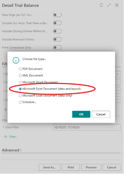 Select “Microsoft Excel Document (data and layout)” and click “OK” to export