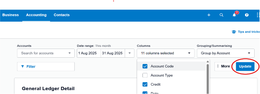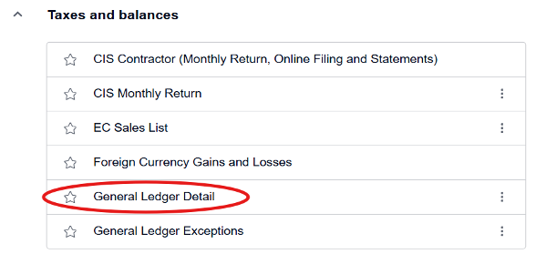 Log into QuickBooks Select "Reports" from the left hand menu On the "Standard Reports" section, scroll down to "for my accountant" and select the "General Ledger list" You are then brought to this screen Select the icon circled and then "Export to ...